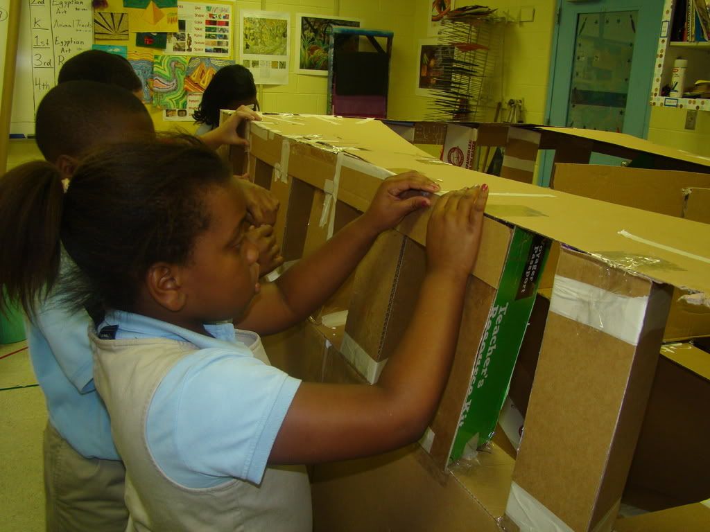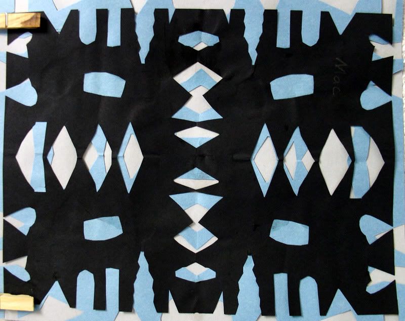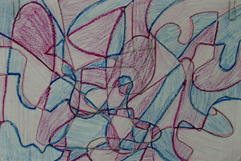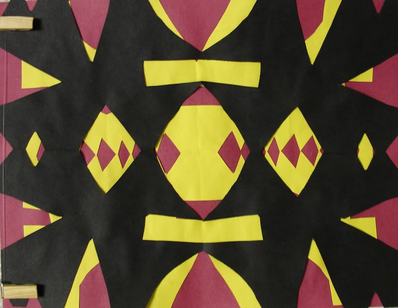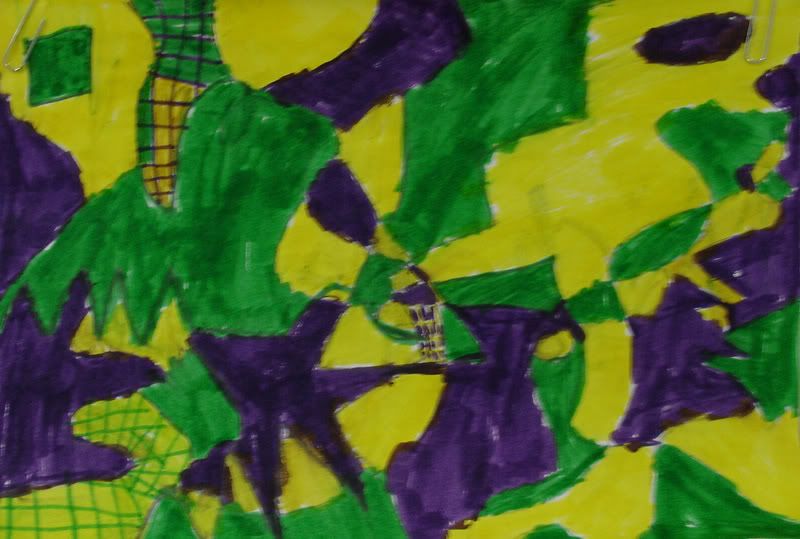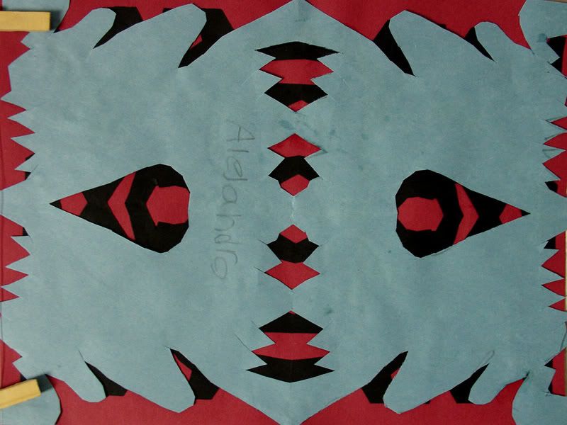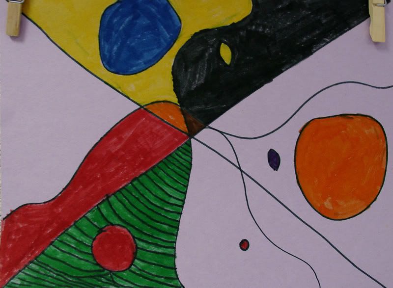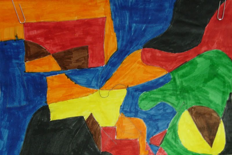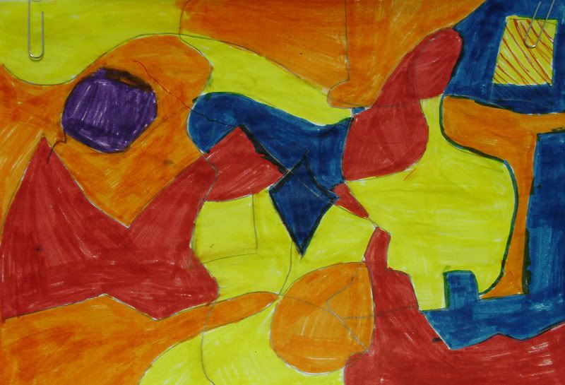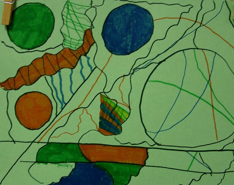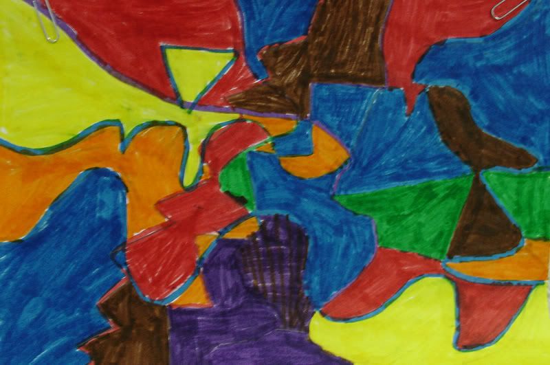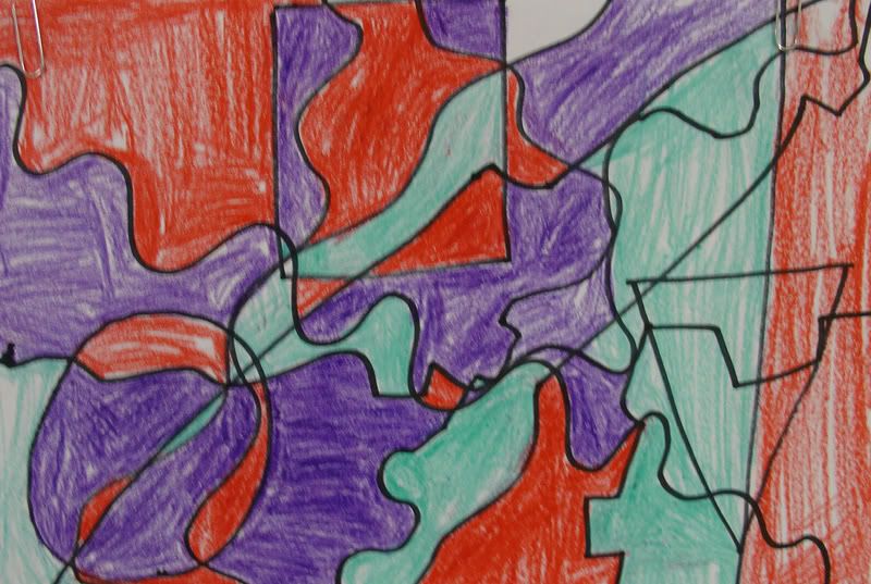 Below are selected works from my K-4 students at Whitsitt, Glenn, and Stratton Elementary Schools. The first selection is from a large sculpture project we did at Glenn to help us learn how to build our own Parthenon model out of cardboard and paper. The second group is a color sheet lesson designed to teach pattern and proper color wheel usage. The third is from a positive-negative space lesson based on verbal directional cues, given by the teacher, and followed by the students. The fourth is from a symmetrical balance/positive space lesson featuring a simple snowflake construction technique. The fifth section is a verbal cue lesson based on contour line drawings.